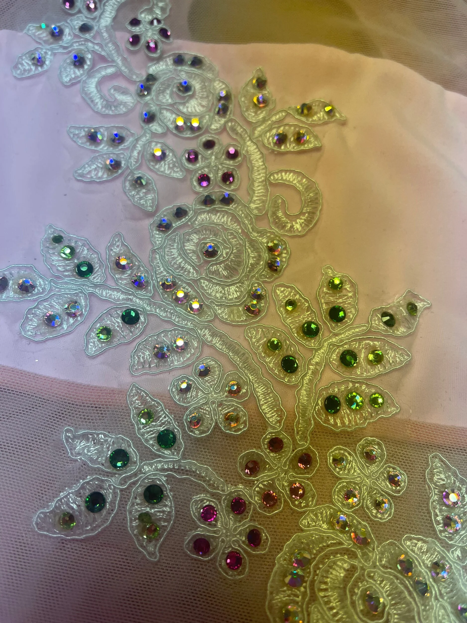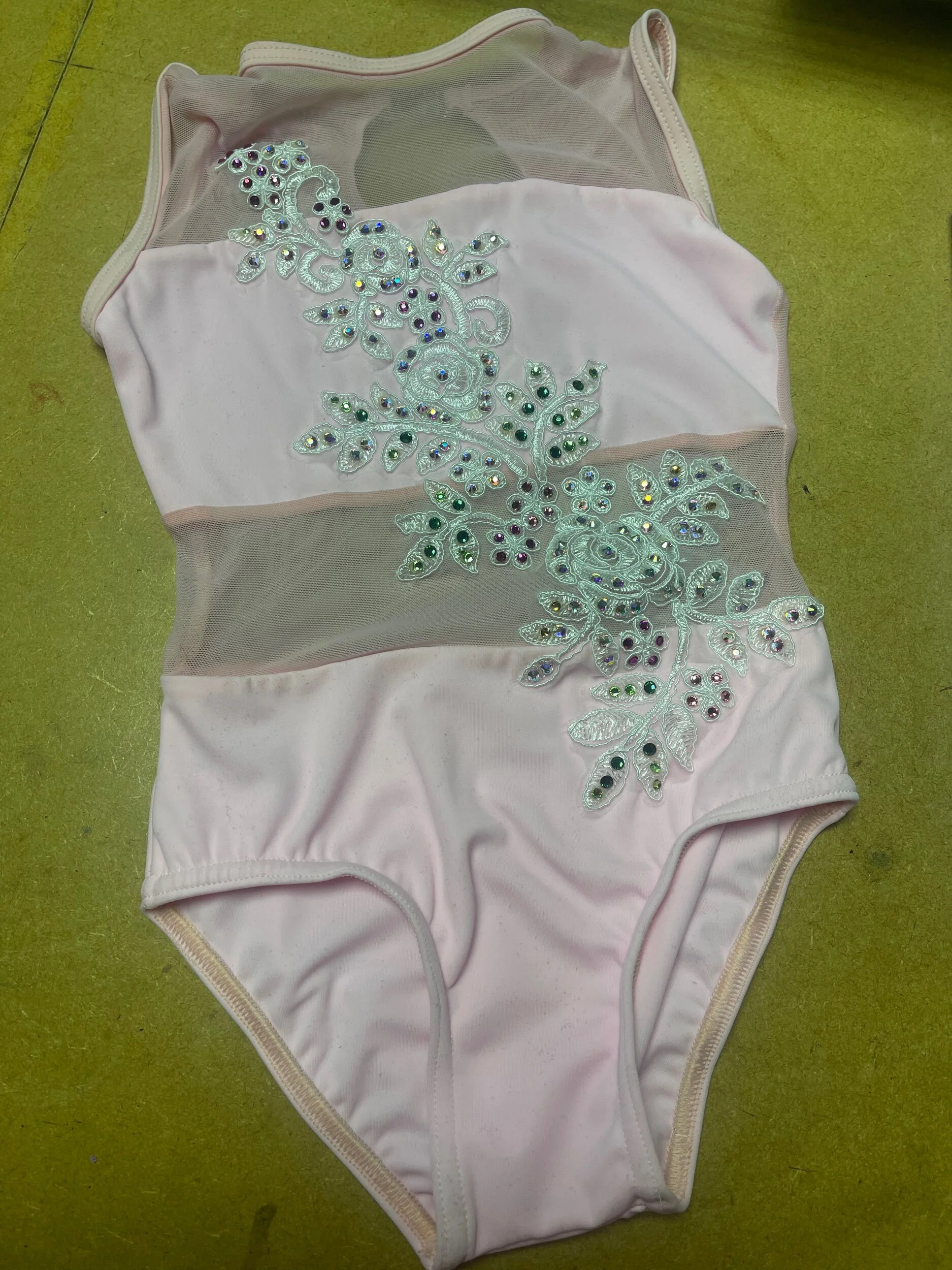 Our chance to get your hands on a one off costume. Baby pink Leo with hand sewn white lace embellishment and scattered with Swarovski crystals